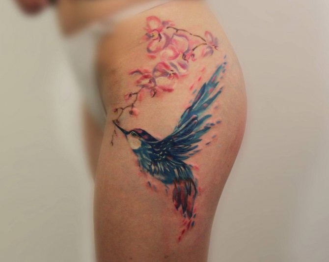 Dans la culture orientale, le colibri est un symbole de grâce, de beauté et de pureté, il est donc typique de les appliquer aux jeunes filles. Les compositions avec des fleurs et un remarquable oiseau miniature sont très populaires auprès des filles. Une option harmonieuse pour les filles serait de faire un tatouage sous la poitrine ou sur le ventre. En choisissant cette zone de votre corps pour un tatouage de colibri, vous indiquerez que vous avez un certain zeste.