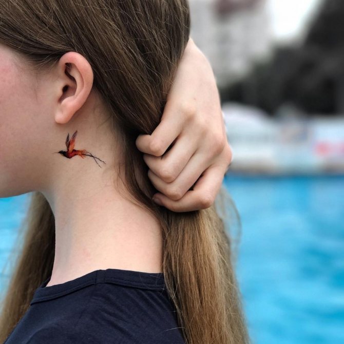En choisissant un emplacement sous l'oreille, il faut tenir compte du fait que l'image sera dans l'esprit du minimalisme, et que l'effet de mouvement donnera une boucle coquine. Dans tous les cas, le tatouage du colibri sera saisissant, ressemblant à une photographie.