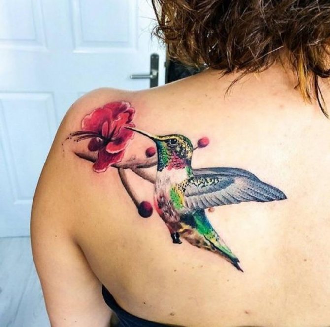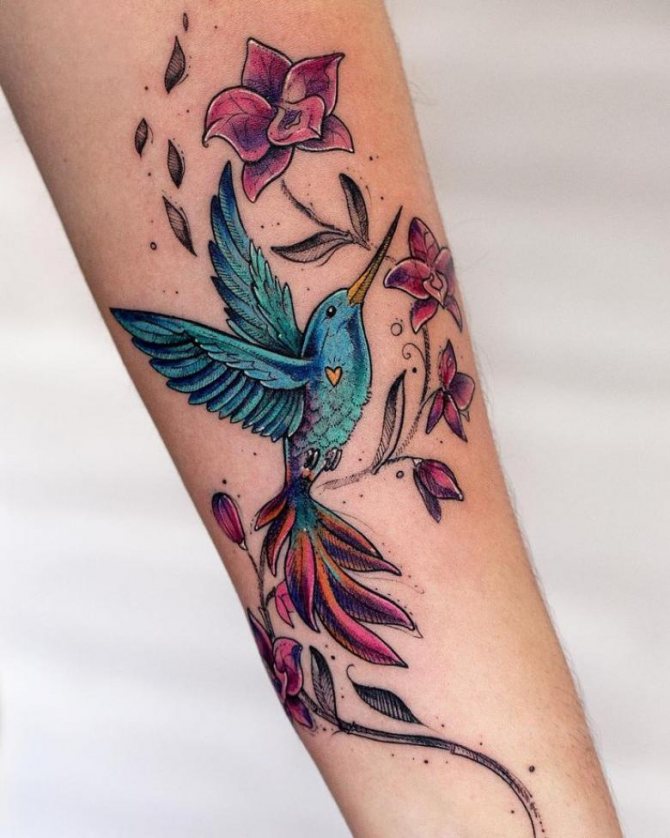 Le tatouage de colibri est caractéristique d'une personne optimiste et positive, qui ne cache pas son caractère ouvert et sincère. Si vous aimez l'exotisme et méprisez tout ce qui est ordinaire, ce tatouage est pour vous. Chez les femmes, une image commune de cet oiseau accompagné de papillons et de diverses fleurs, ce qui permet de mettre en valeur sa douceur et sa grâce.