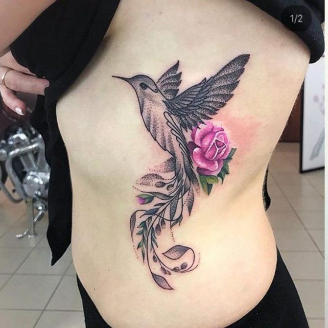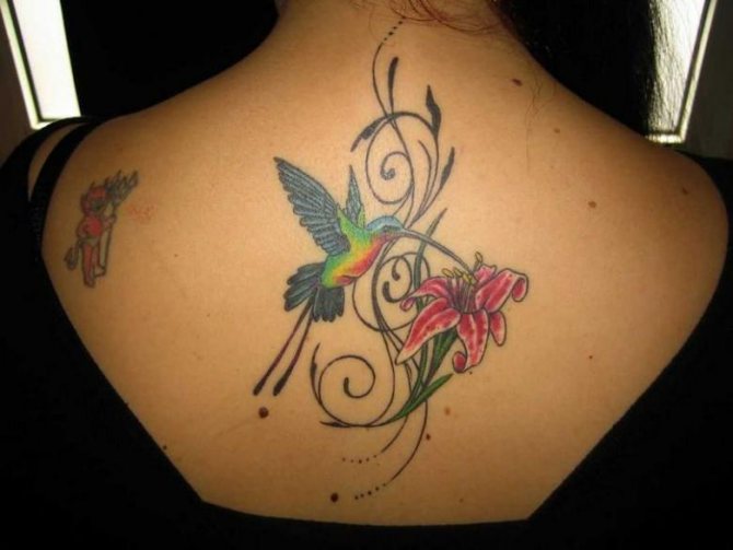 8. Joie et prospérité. Le colibri est le plus souvent représenté avec une fleur, dont il utilise son long bec pour boire le nectar. Dans ce cas, le tatouage symbolise le bonheur, le succès dans les affaires et la chance.