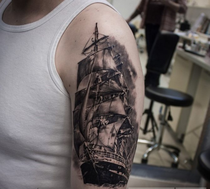 Le réalisme est la façon la plus simple de représenter quelque chose en le reproduisant dans ses moindres détails ; Graphique. Il s'agit d'un dessin réaliste d'un navire au crayon. Bien sûr, imité avec une machine à tatouer, le Thrash Polka est un style à la frontière entre le réalisme et plusieurs autres techniques. Couleurs - noir, blanc, nuances de gris, rouge
