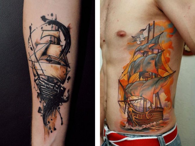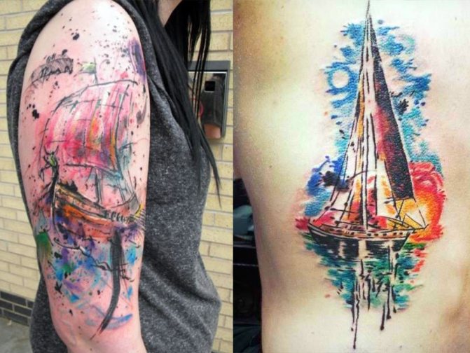 En utilisant le style aquarelle, le tatouage de bateau peut être rendu plus brillant et plus inhabituel. Il s'agit d'une tendance plus jeune, mais en plein essor, et qui recueille un grand nombre de fans.