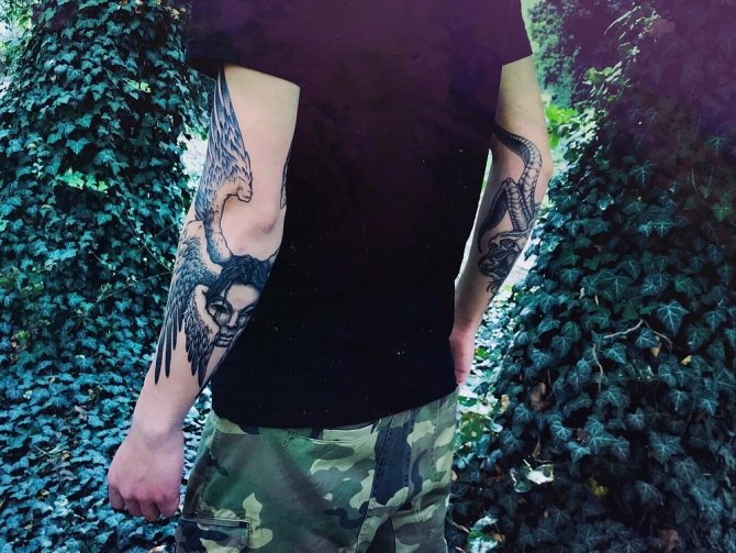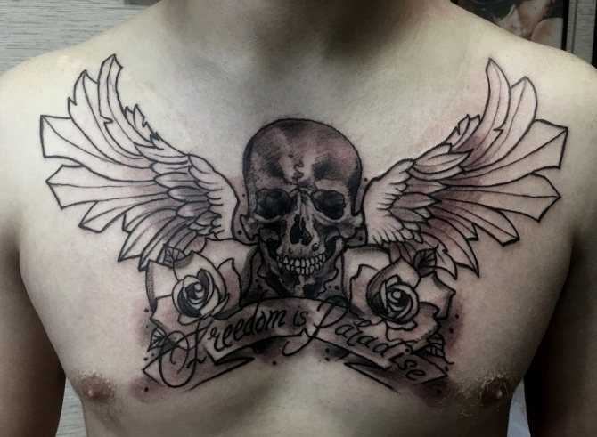 Le symbolisme de ces images est basé sur une devise simple : "La liberté ou la mort ! Les amateurs de tatouages qui privilégient les tatouages à connotation sinistre et mystique, les personnages de l'au-delà ou les armes ont tendance à adopter un comportement risqué et désespéré. Le tatouage est un défi à la société et un signe de rébellion. Les hommes optent pour un tatouage ailé sur le dos, les épaules, la poitrine, le cou ou la manche.