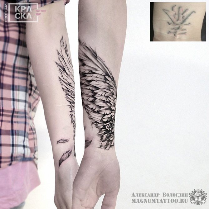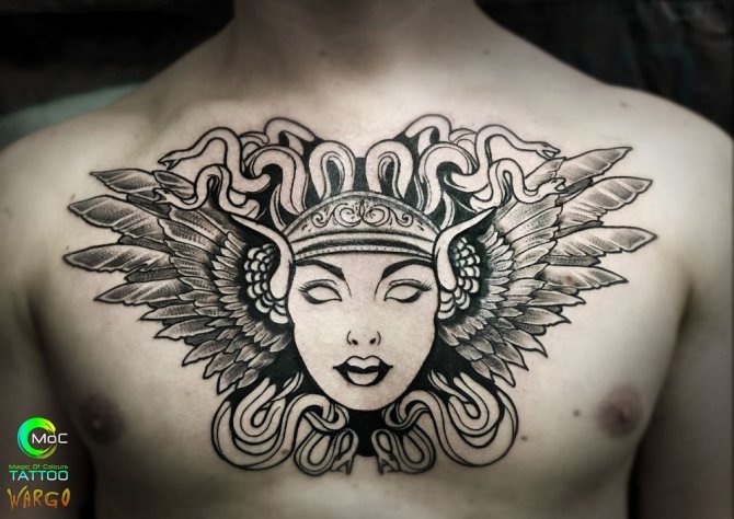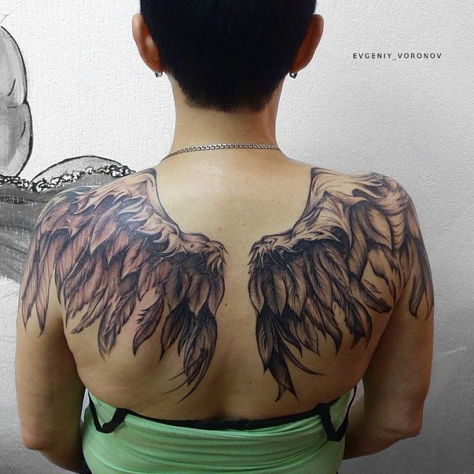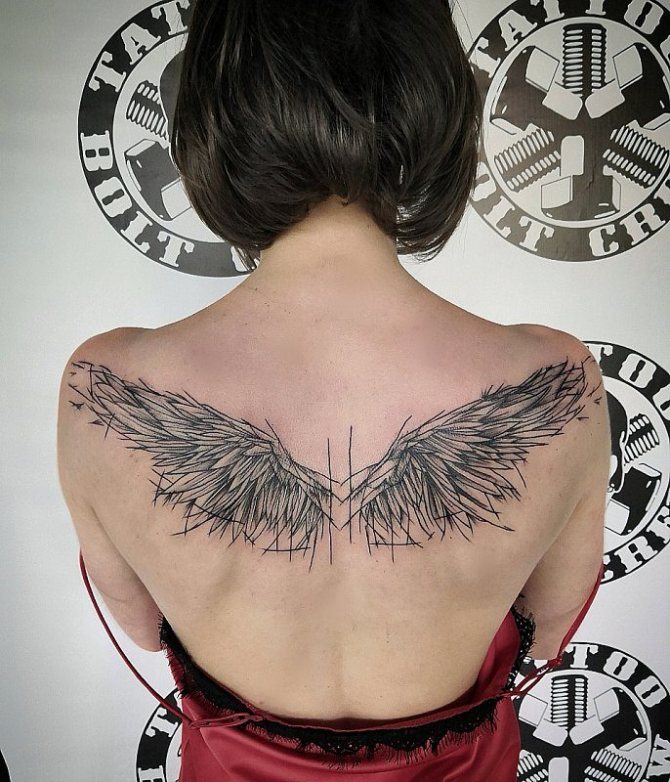 Le tatouage avec des ailes dans le dos est considéré comme un signe plutôt ambigu et la signification du croquis dans ce cas dépend des détails et de la nature de l'image globale. Dans ce cas, la signification du dessin dépend directement de la nature de l'image globale. Il peut s'agir d'ailes grandes ouvertes, tombantes ou brisées. Pelucheux, palmés, de couleur sombre ou claire. Le choix dépend entièrement de ce que vous voulez que l'image transmette, mais dans tous les cas, le tatouage sur votre dos est de taille différente et a un aspect très distinctif.