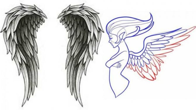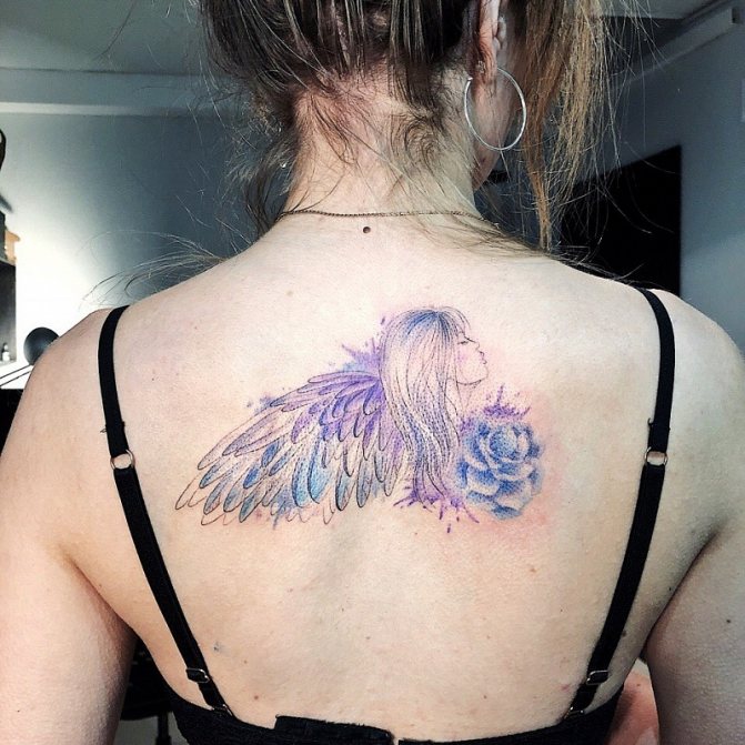 L'image des ailes d'ange n'est pas toujours liée à la religion, car chacun d'entre nous ne peut être humain et appartenir à l'entourage des anges en même temps. Dans la plupart des cas, les ailes d'un ange sont placées sur le corps en mémoire d'un être cher qui a quitté le monde des vivants. En outre, une telle esquisse indique un désir d'être exalté par les soucis et la vanité du monde. L'image d'une aile d'ange sur le corps d'une femme indique sa beauté, sa pureté et la propreté de sa pensée. Le symbole sur le corps d'un homme dépeint la bonté de l'âme de celui qui le porte. Il n'est pas rare que ce type d'ailes soit complété par le tatouage d'un halo, d'inscriptions de noms ou d'initiales, d'un cœur ou de fleurs.