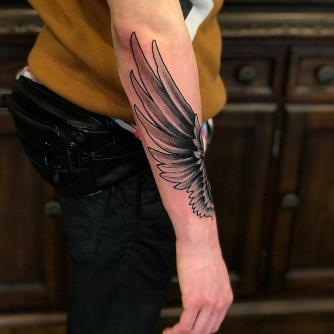 Les ailes de l'aigle, par exemple, indiquent une personnalité créative et indépendante qui ne peut vivre sans vitesse et sans aller de l'avant. Ces personnes sont déterminées à atteindre leurs objectifs et ne cachent souvent pas leur supériorité sur les autres. L'image des ailes avec un crâne est un symbole de détermination, de force et de victoire sur la mort. Et les ailes de dragon démontrent une grande force et un grand défi.