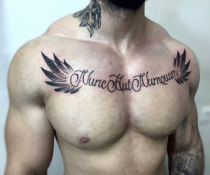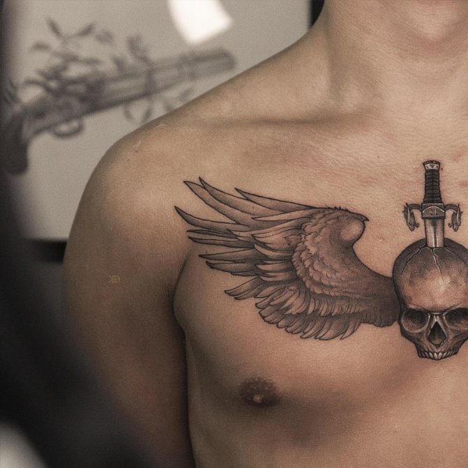 Les représentants masculins préfèrent appliquer au corps des images plus volumineuses et expressives qui soulignent la force et la puissance de son propriétaire. Par conséquent, le symbolisme le plus courant des personnages masculins est le désir et l'aspiration à se débarrasser des problèmes du monde, la liberté de pensée et l'élévation spirituelle. Il n'est pas rare non plus que les ailes soient un rappel des pertes, des défaites et des souvenirs douloureux. Les plumes de ces tatouages rappellent la lame d'un couteau, et le tatouage dans son ensemble présente un contour clair et des lignes brisées. Les détails du design tels que les squelettes ou les crânes suggèrent une nature contradictoire et l'amour du risque.