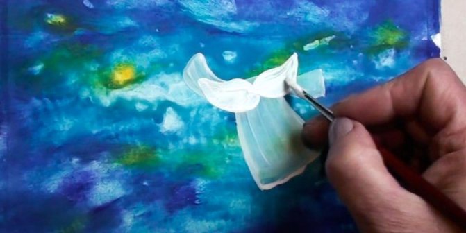 - Le papier doit être humidifié, puis couvert de points et de taches bleus (pour cela, peindre avec un pinceau humide). La peinture bleue est utilisée autour des bords et la peinture jaune près du milieu de la feuille ;