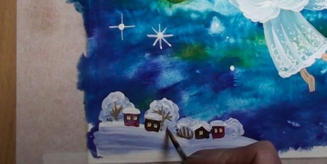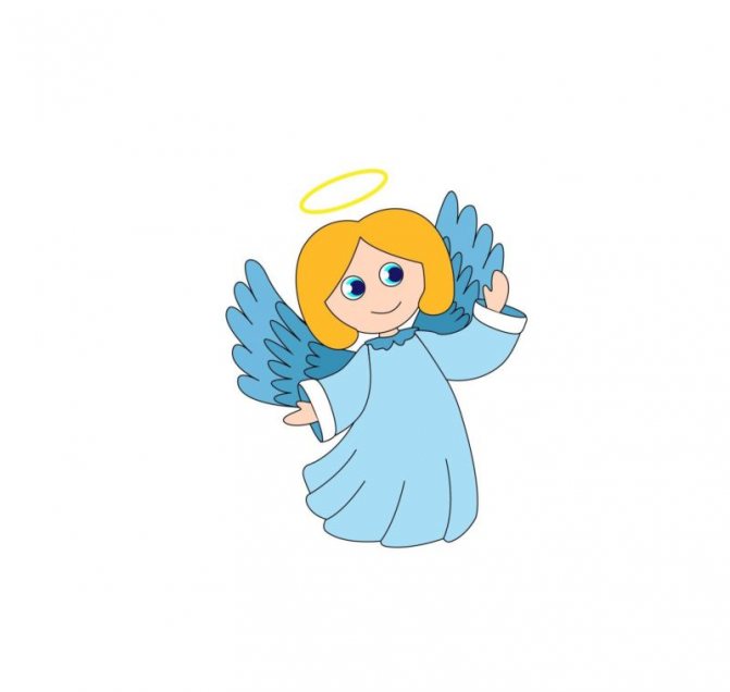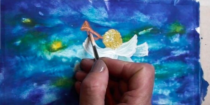 - Au-dessus de la tête, une auréole peinte à la gouache jaune, et dans les mains levées d'un ange - la pipe, l'expressivité peut être ajoutée en mélangeant la peinture jaune à un peu de brun ou d'orange.