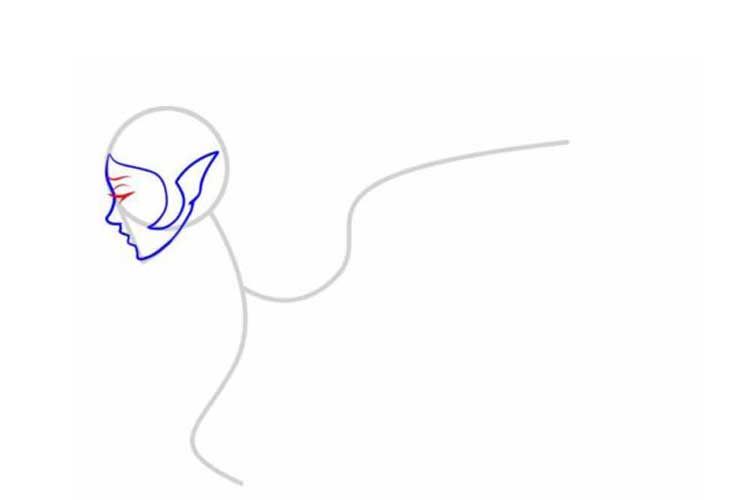 À partir du visage vers le bas, en utilisant des lignes divergentes, on dessine une robe avec des manches triangulaires et un col en forme de W. Tracez une ligne arrondie au niveau des paumes, les traits indiquent les doigts. Des lignes similaires sont tracées sur les jambes depuis le dessous de l'ourlet.
