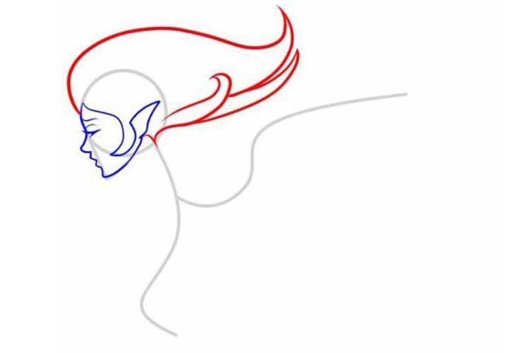 Il faut maintenant ajouter quelques détails : sur la robe - les plis, sur les ailes - les plumes, tracer les contours de base et effacer les traits inutiles.