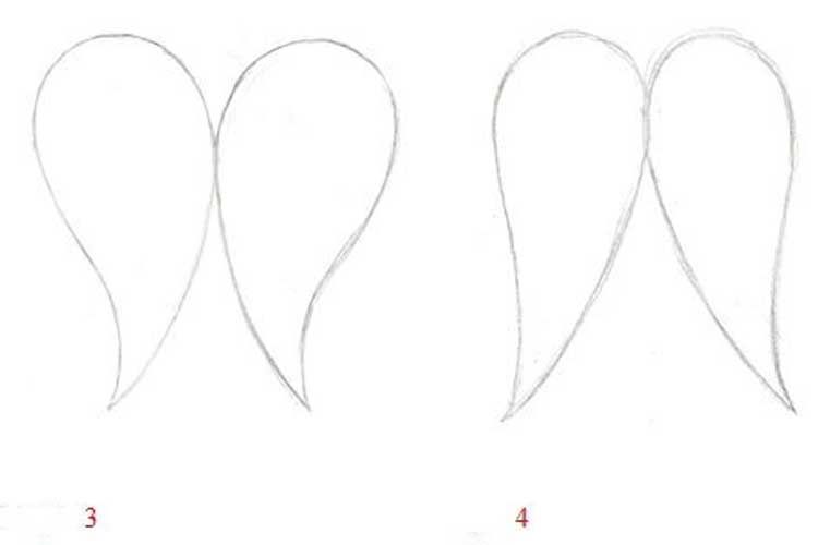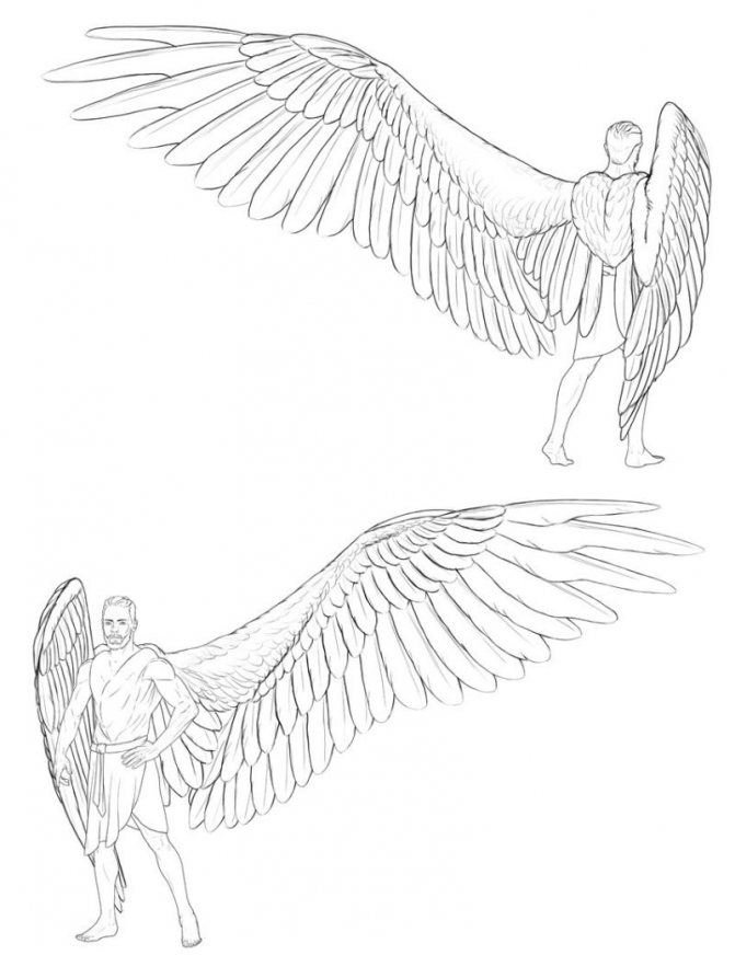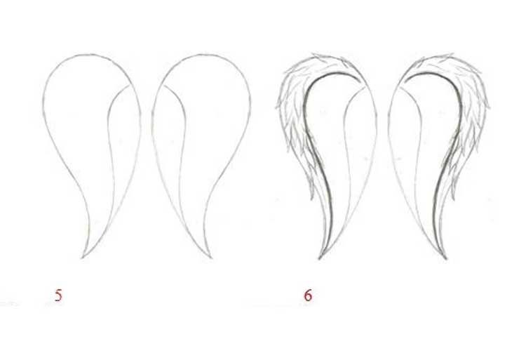 Il est utile de préciser comment dessiner les ailes d'ange : pliées ou ouvertes - c'est un choix individuel, mais les ailes sont colorées par des plumes. Ils doivent être longs et fins en bas et petits en haut. Il vaut la peine de copier les ailes à partir d'une image et de s'entraîner à les tracer pour acquérir cette compétence.