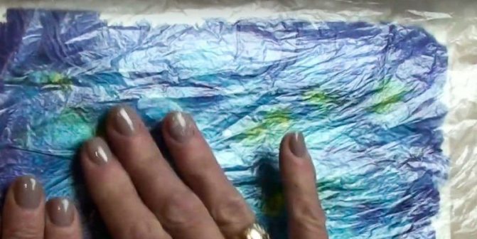 - puis la peinture humide est recouverte d'une feuille et bien lissée (sans appliquer trop de pression). Cela permet de rendre l'arrière-plan du dessin texturé. Le film est retiré et le dessin est laissé à sécher ;