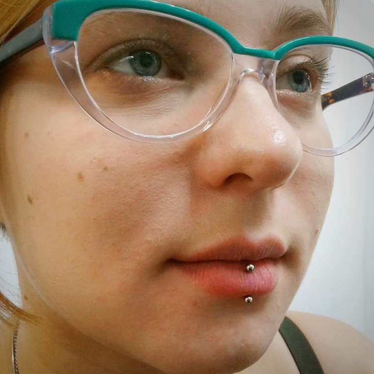 - Labret vertical. Le piercing s'effectue du bord inférieur de la lèvre jusqu'au centre de la lèvre. L'alignement exact du bijou est important et il doit être maintenu très vertical.