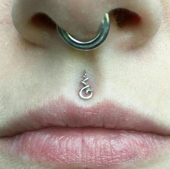 - "Medusa. Elle peut être verticale ou horizontale. Le bijou est percé dans la région de la plaque nasolabiale. En général, on installe un anneau d'oreille spécial, équipé d'un dispositif de retenue aplati.
