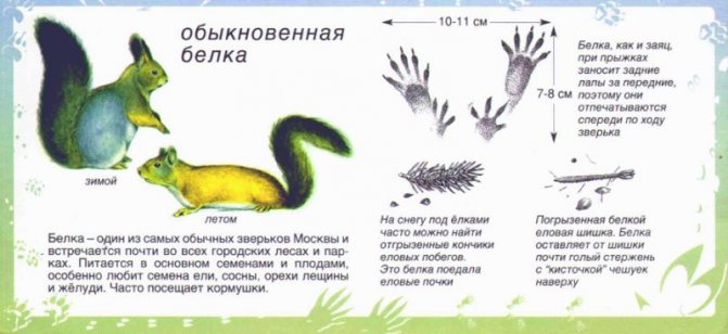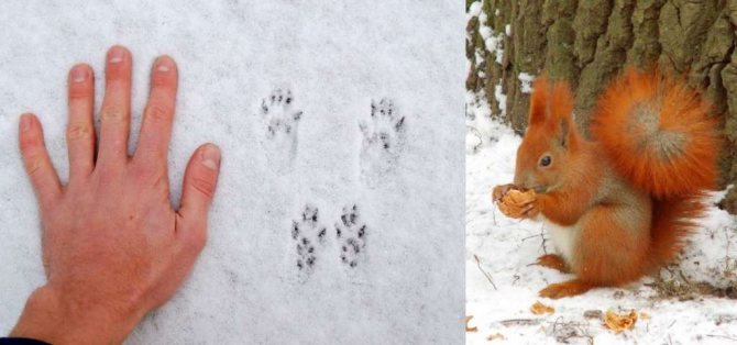 Les écureuils sont actifs aussi bien en été qu'en hiver. À la recherche de nourriture, ils sautent d'arbre en arbre et descendent parfois au sol, laissant des traces sur place.