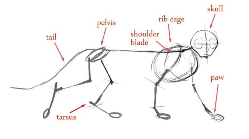 La forme du corps de chaque animal est définie par deux niveaux anatomiques : squelettique et musculaire. Elles peuvent être cachées sous la fourrure et la peau, mais sans elles, le chat serait informe. Heureusement, vous n'avez pas besoin d'apprendre la forme de chaque os et le nom de chaque muscle - il vous suffit de dessiner ce que vous voyez.