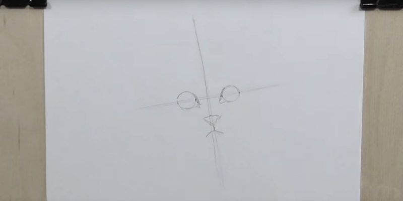 Sur le morceau positionné horizontalement, tracez les yeux. Un peu plus bas se trouve le nez et le cercle qui deviendra la partie convexe du museau. La symétrie est respectée : l'œil droit doit être à la même distance du nez que l'œil gauche.