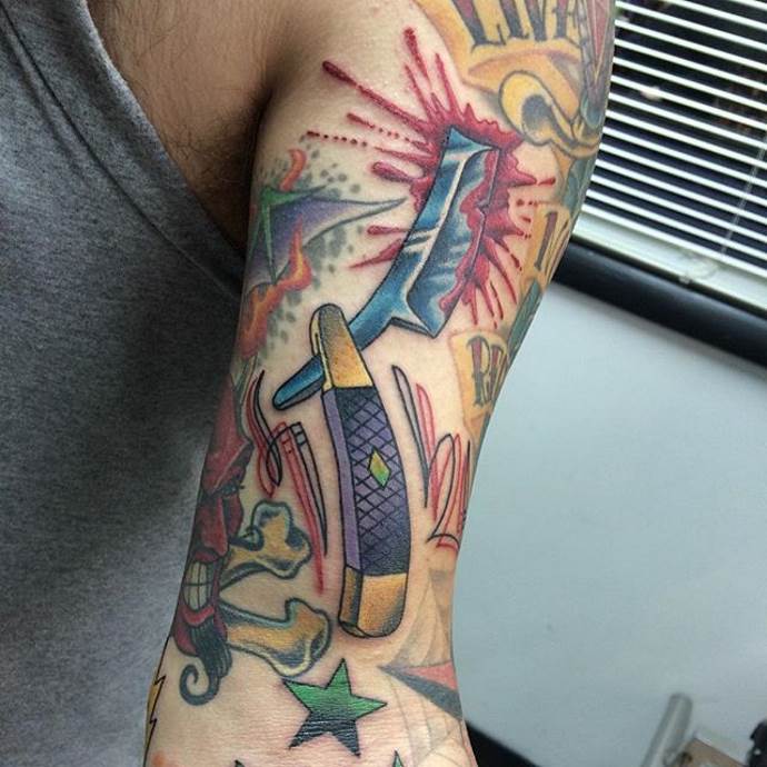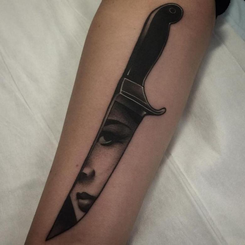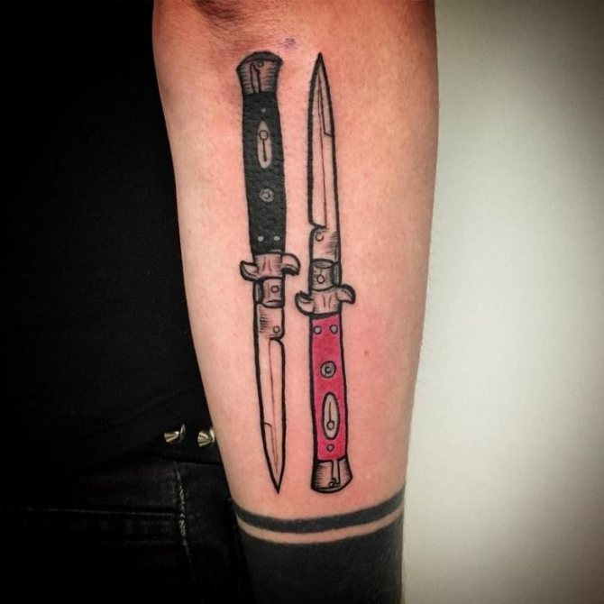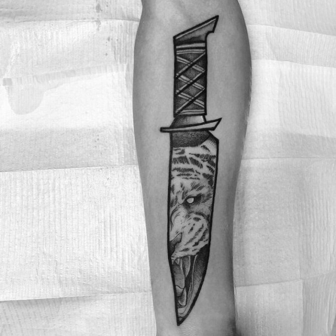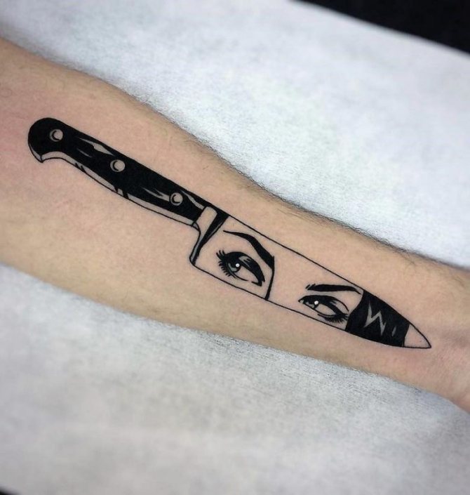 - La solitude. C'est la signification du tatouage d'un couteau sur le bras, basé sur le fait qu'il est préféré par les personnes autonomes. Le plus souvent, un tel design est réalisé dans un style minimaliste.