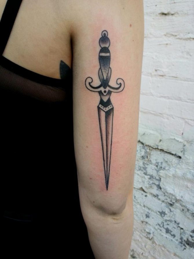 Le tatouage en forme de poignard est désormais un tatouage très populaire et recherché. La dague est un tatouage qui a généralement la préférence des hommes, mais il y a aussi des femmes qui souhaitent l'avoir sur leur corps. Le caractère principal de la dague est la fermeté physique et spirituelle, la traîtrise et la trahison. Ce motif ayant de nombreuses significations, la dague est souvent complétée par d'autres éléments, tels qu'un crâne, un serpent, un cœur, etc.