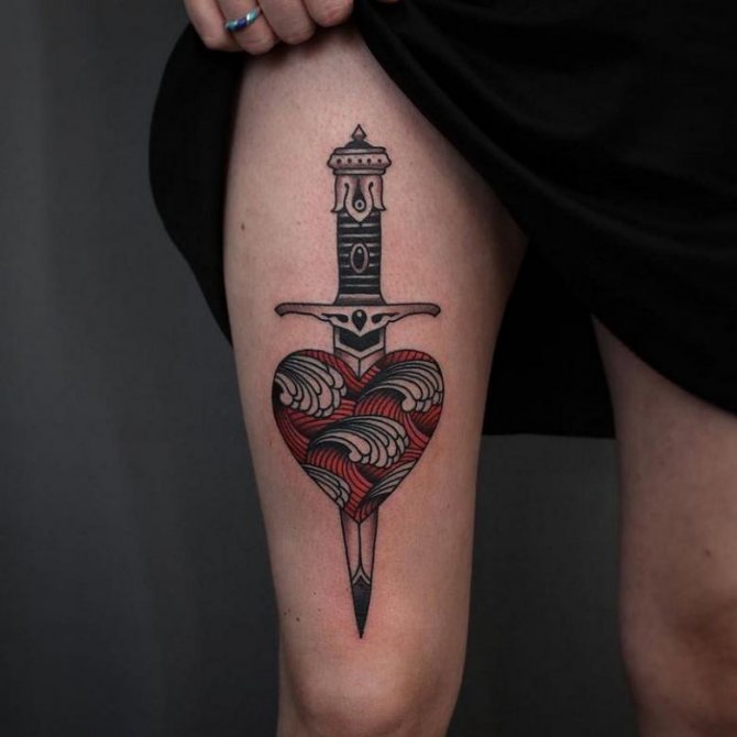 - Il est très fréquent de trouver un couteau perçant le cœur. Il s'agit d'une trahison, d'un amour non partagé, d'un traumatisme - mental et physique, d'une erreur dans les sentiments qui ne peut être réparée. Il y a probablement eu une sorte de sacrifice pour le bien d'un être cher. Une autre signification est un avertissement, la loyauté en amitié, une présence d'esprit combative.