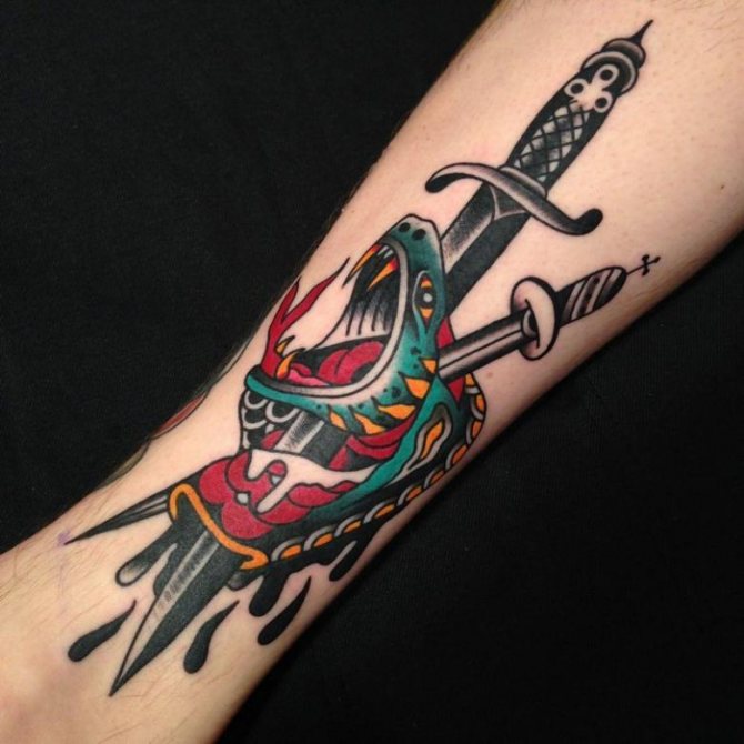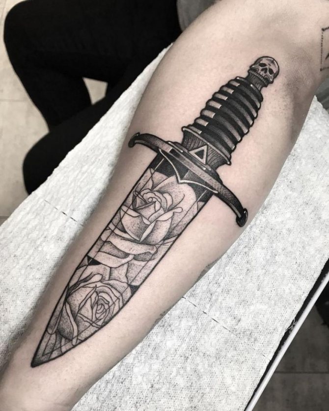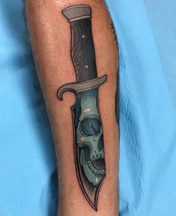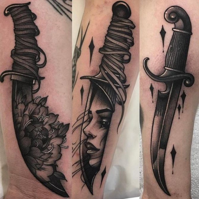 Il n'est pas rare de voir une image sur la peau d'un homme sous la forme d'une lame de couteau, d'une épée ou d'un poignard nu. Elle est l'image d'une menace, cachée ou ouverte, ainsi qu'un signe de force intérieure, de capacité à se défendre et à protéger. Mais l'autre face d'un tel dessin est une soif de projeter son agressivité, qui n'est pas toujours une menace consciente.