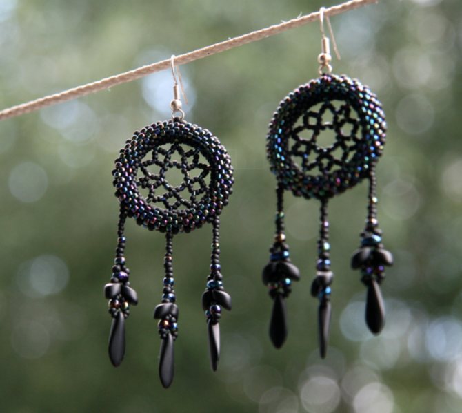 Cercle suivant de 8 pièces, puis de 6 pièces. N'oubliez pas d'amener l'aiguille au milieu. Lorsque vous atteignez le cercle de 4 perles, répétez le cercle 2 fois. Puis deux séries de 2 perles chacune. Le dernier cercle sera de 1 pièce chacun. A la fin, fixez le fil avec de la colle, coupez l'excédent. La toile d'araignée est prête et vous pouvez la décorer avec des plumes.