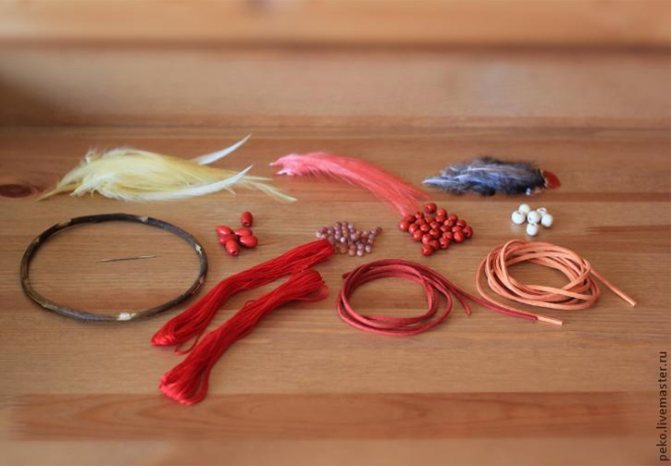 Pour fabriquer une amulette, vous avez besoin d'éléments de base qui sont utilisés dans toutes les variantes de l'amulette : une branche de saule (vous pouvez utiliser un cerceau, du métal et autres) ; des fils (cordon, cuir, tissu, etc.) ; des perles, des perles, des pierres ; des plumes (attribut obligatoire).
