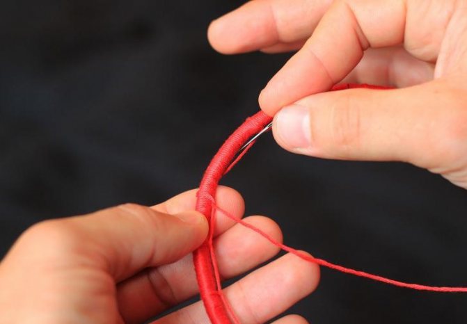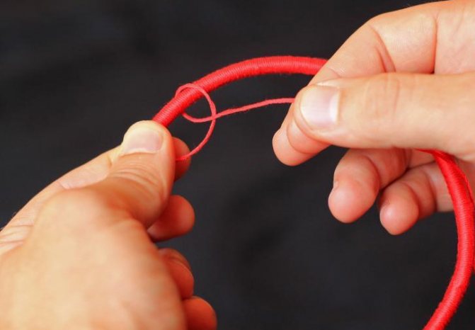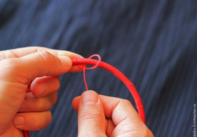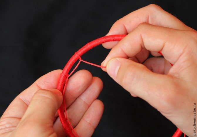 Dans un premier temps, nous commençons par fabriquer la base. Enroulez fermement l'anneau métallique autour du cordon, en faisant un nœud aux extrémités. Appliquez de la colle sur le nœud. Ensuite, enroulez un fil autour de la base et nouez-le également. L'étape suivante consiste à mesurer le cordon (enroulez-le deux fois autour de votre poignet et coupez-en deux morceaux). Un morceau est plié en deux, inséré dans un anneau, une boucle est faite et serrée. Avec la deuxième pièce, on procède de la même manière. Sur deux segments, on fait des nœuds à la même distance. Faites une serrure.