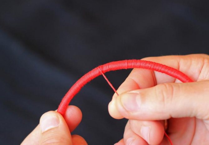 Dans notre cas, nous prenons la dentelle préparée, nous la plions soigneusement en deux et nous la fixons sur l'arceau comme indiqué sur l'image. Vous devez mettre un brin en haut et trois en bas.