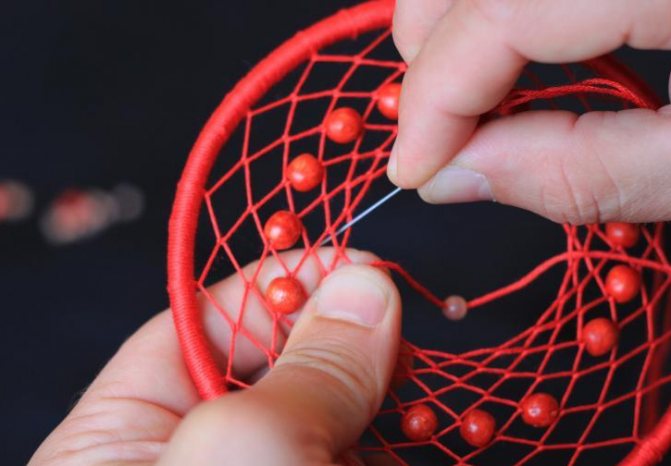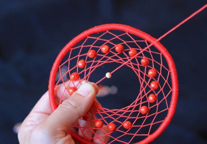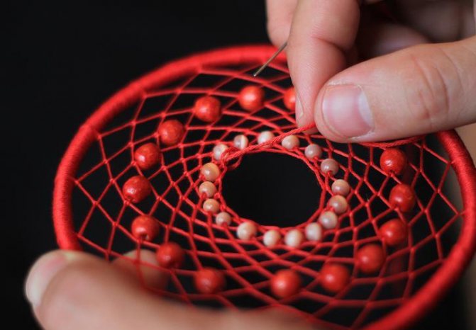 Dans du carton, découpez la base, qui est enveloppée de fil. Utilisez le même fil pour faire une toile d'araignée en tissant des perles. Laissez une boucle pour attacher le capteur de rêves.