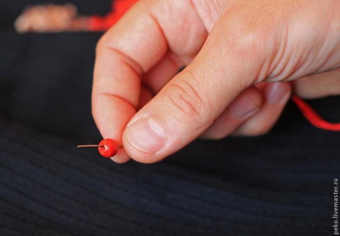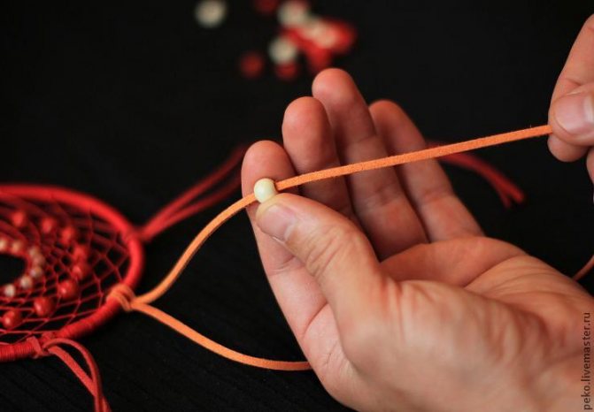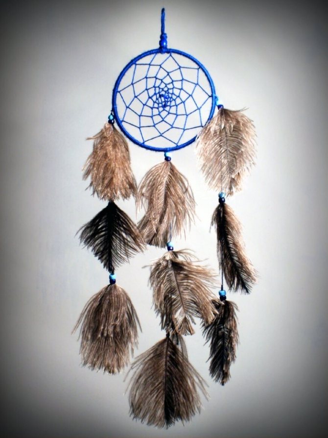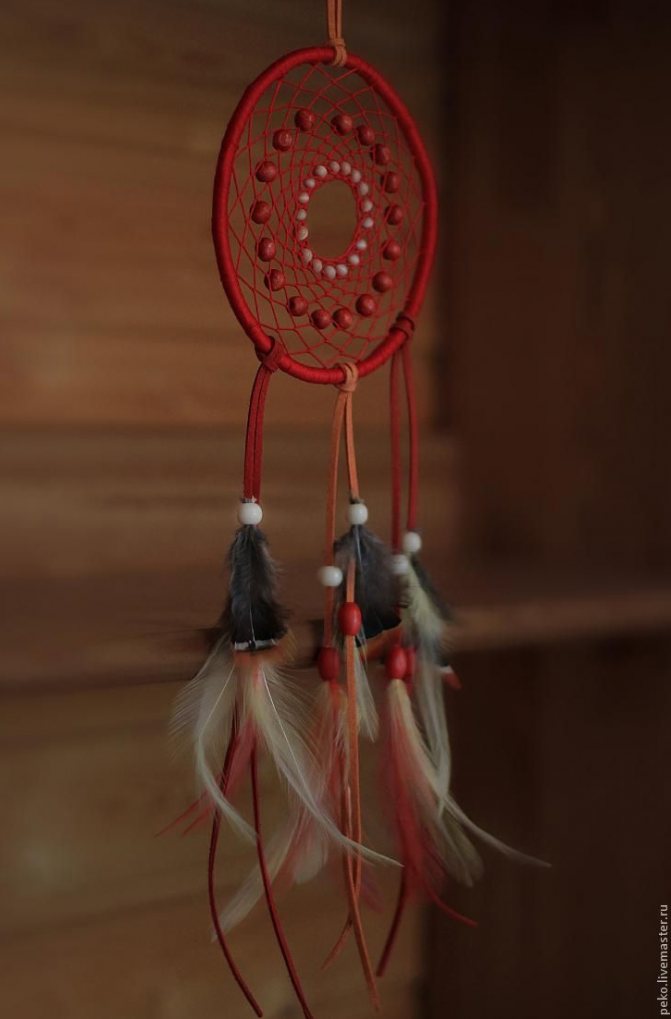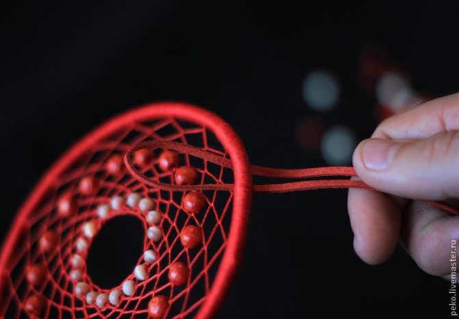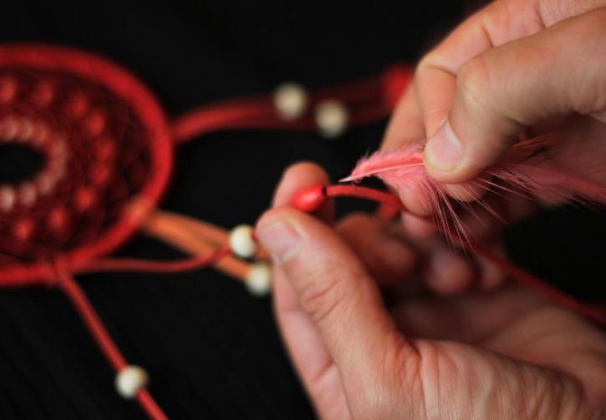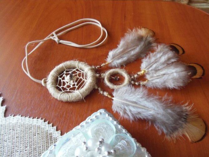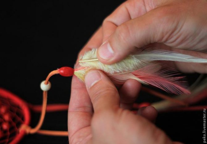 Au milieu, fixez une perle. Fabriquez ensuite un pendentif auquel le piège sera suspendu. L'étape finale consiste à attacher les plumes. Attachez-les ensemble avec un fil, enroulez un morceau de cuir et attachez-le à l'anneau.