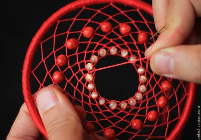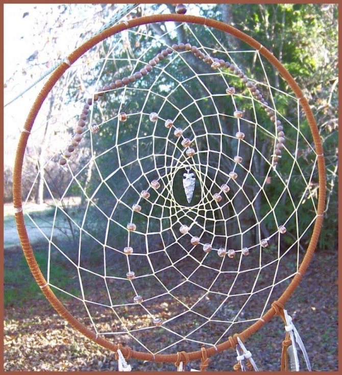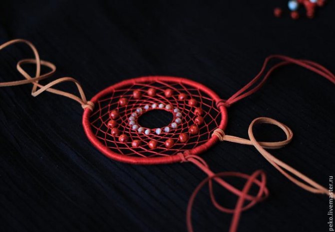 Cette amulette est fabriquée de la manière habituelle. La base est également enveloppée de fils (utilisez des fils multicolores), puis une toile d'araignée est réalisée à l'aide de fils. Les perles, les pierres et les perles peuvent être enfilées sur une toile d'araignée. Veillez à faire une boucle pour suspendre l'amulette. Il est également possible de décorer le trappeur comme bon vous semble - utilisez des cailloux, des coquillages, des perles ou des perles de rocaille.