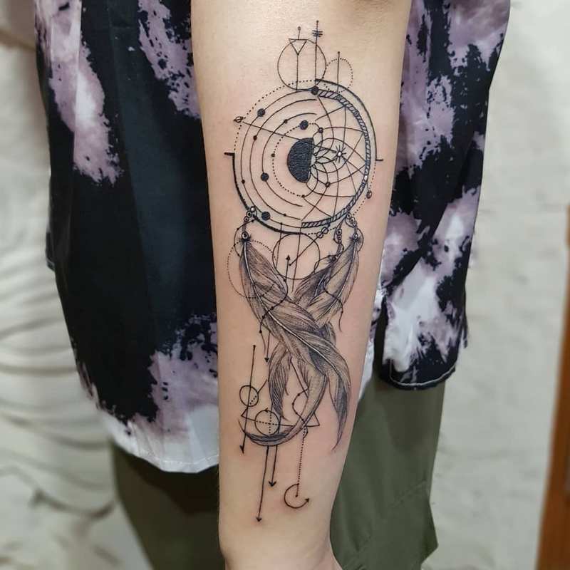 Un style très rare du tatouage Dreamcatcher Geometry propose de compléter la forme géométrique de base (forme de cercle) du piège avec d'autres formes géométriques sans rompre l'harmonie générale de la composition. Le cercle étant l'une des formes les plus simples, les triangles et les lignes droites lui conviennent parfaitement. En outre, les petits cercles supplémentaires ne créent pas de déséquilibre dans le tatouage et n'entraînent pas de signification inutile.