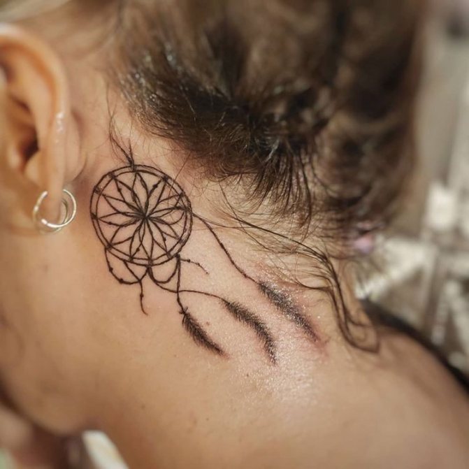 Pour compléter la liste des meilleurs emplacements pour les tatouages d'attrape-rêves chez les hommes et les filles, la zone située sur le côté du cou, dans la partie inférieure près de l'oreille. Là-bas, il est d'usage de fabriquer des pièges de petite taille, purs comme les autres, sans les associer à d'autres objets.