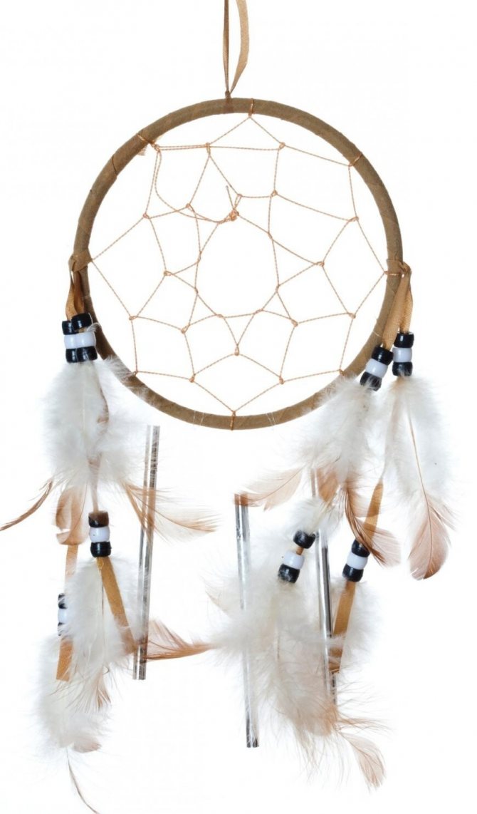 Il s'agit d'un cerceau en bois avec une maille tissée à l'intérieur et un trou au milieu. Des plumes sont attachées au bas du cerceau.