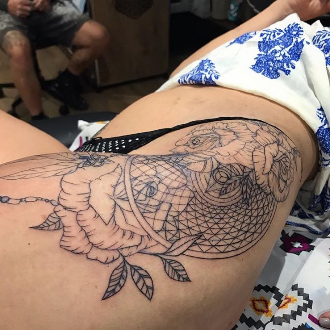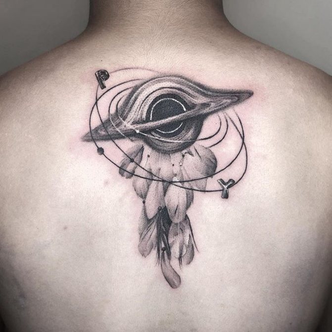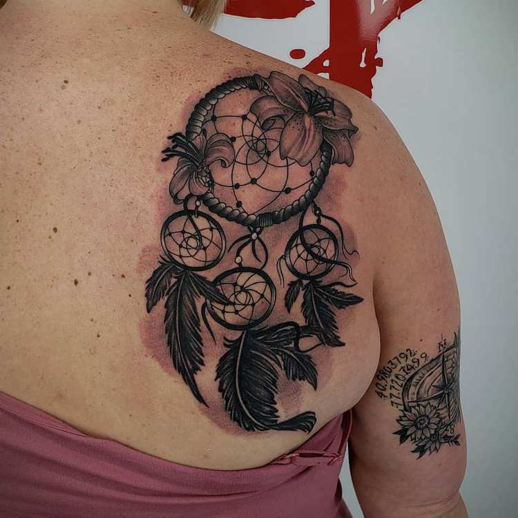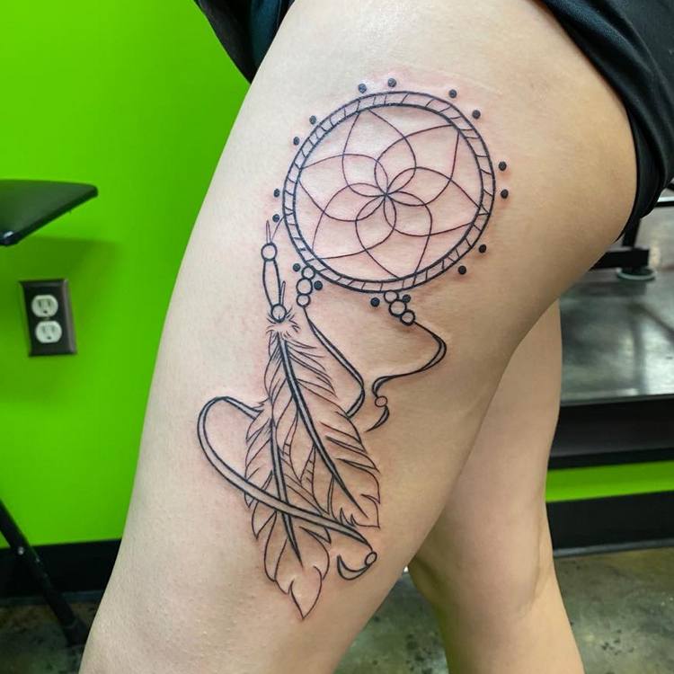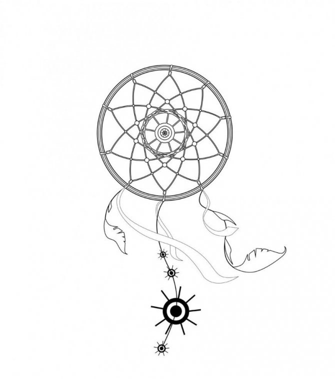 Il n'est pas difficile de dessiner un tatouage d'attrape-rêves sur le corps avec des lignes de contour régulières, surtout si l'artiste l'a fait une centaine de fois. Toute la beauté et l'élégance du style sont construites sur les lignes confiantes qui ne s'estompent pas sous la couche de peau, affichant la toile régulière d'un piège de rêve mystique. Le motif caractéristique du tatouage, qui consiste à tisser des fils en cercle, permet d'identifier sans équivoque l'objet comme étant l'intention originale de la composition du tatouage, construite de manière complexe.