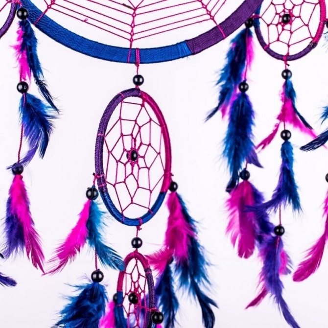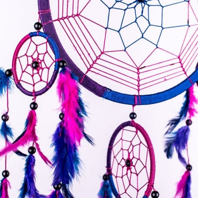 Le capteur de rêves n'est pas une simple amulette et doit être réalisé en toute conscience. Avant de vous lancer dans sa fabrication, vous devez d'abord en déterminer la couleur. Il n'est pas recommandé de fabriquer une amulette très lumineuse. Sinon, vous ferez des rêves colorés qui empêcheront le dormeur de dormir. Chaque couleur symbolise quelque chose : le noir signifie calme, paisible, mystérieux. C'est une couleur féminine qui symbolise la force et le pouvoir. Si cette couleur est présente dans l'amulette, la force d'esprit sera renforcée. Le blanc est un symbole de pureté, de purification, de tranquillité, de guérison et de réussite. Cette couleur est capable de purifier des influences négatives, et de charger en vigueur et en énergie. La couleur rouge dans l'amulette fournira de l'énergie positive, donnera du pouvoir. Le rose est un symbole de beauté, d'harmonie féminine, de tendresse, de gentillesse et d'amour incroyable. Veillez à utiliser cette couleur dans votre amulette - elle réveillera l'amour perdu de la vie. Des nuances vives de jaune, cela signifie la liberté, l'admiration. Il vise la guérison physique et mentale, renforce le système immunitaire du corps. L'orange symbolise un sentiment de joie, de rythme et de mouvement. Les nuances de vert dans une amulette apportent harmonie, détermination, vie et foi. Cette couleur remplit une personne d'énergie positive. Le bleu est considéré comme un symbole de paix, de légèreté, de tranquillité, de créativité. Les éléments de la teinte bleue de l'amulette rempliront une personne de bonnes pensées et contribueront à la purification de l'esprit. Le bleu représente la vérité, la sagesse, la paix et l'harmonie. Le violet mise sur la compréhension mutuelle, l'humilité, la dynamisation.