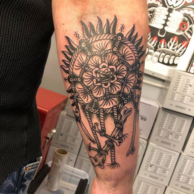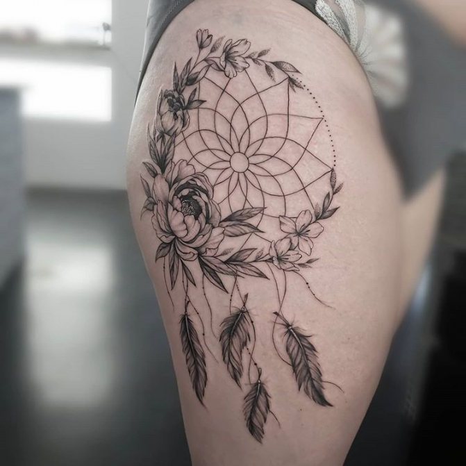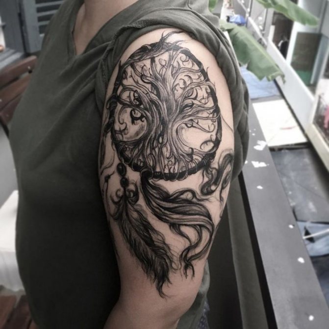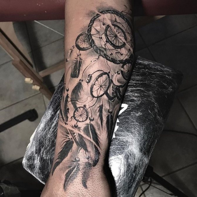 Le style Blackwork n'est pas le plus demandé par les filles, il est plutôt destiné à la moitié masculine de l'humanité. L'attrape-rêves est appliqué avec un pigment de couleur noir intense et une teinte dense et transparente. D'autres couleurs peuvent être utilisées dans la composition, mais uniquement pour des éléments secondaires, de soutien. L'accent est mis sur le cercle avec la toile d'araignée pour les rêves.