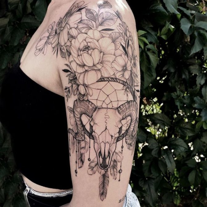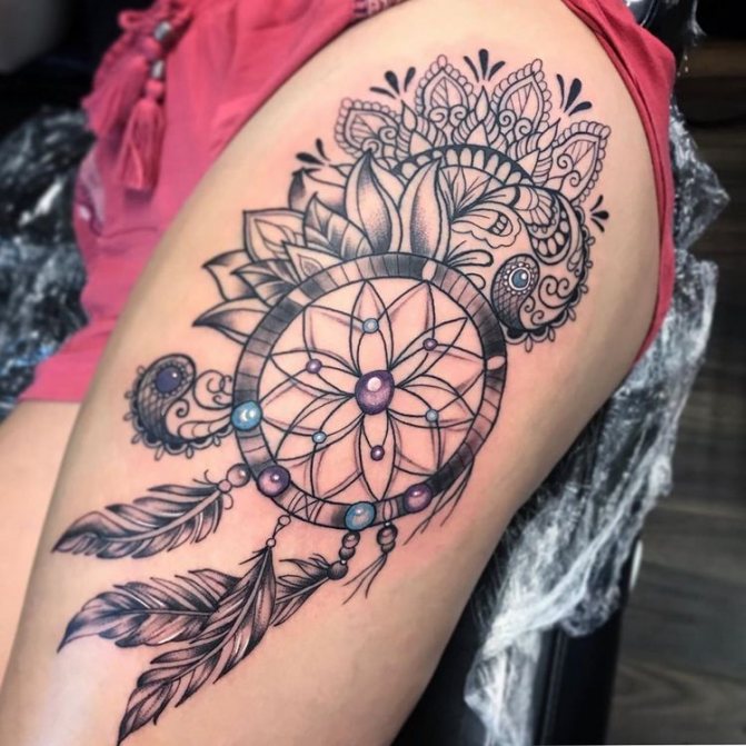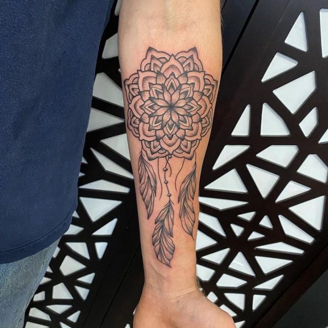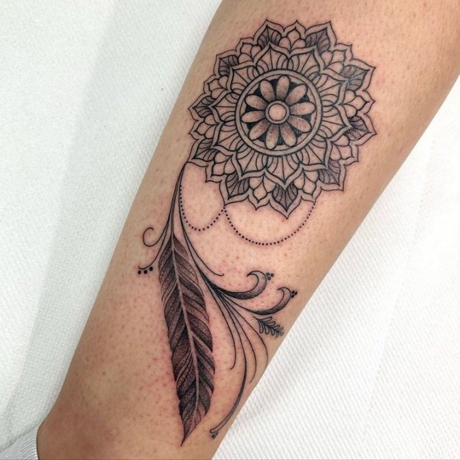 Le style ornemental est capable de combiner deux des thèmes les plus populaires dans un tatouage - l'attrape-rêves et le mandala. Deux cultures issues des continents lointains de l'Inde et des États-Unis ont fusionné en un seul design, offrant au monde une œuvre d'art véritablement enchanteresse. Le motif peut soit remplacer le cercle, en assumant le rôle de la toile d'araignée entière, soit servir de toile de fond secondaire, en se détachant en partie de l'élément principal du tatouage.