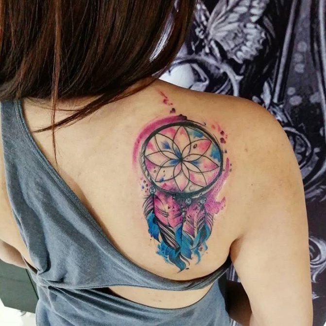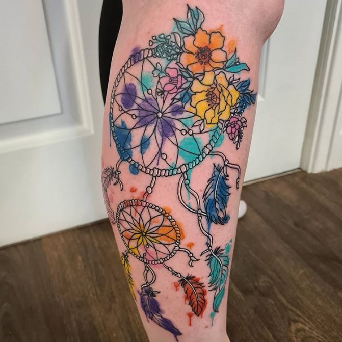 L'un des styles les plus courants parmi les tatouages de dreamcatchers. Il représente un peu plus de 40 % de tous les tatouages réalisés avec cet objet magique. La composition peut prendre la forme d'une seule couleur vive imitant la peinture d'art à l'eau, ou d'une palette entière ressemblant à un bouquet festif des couleurs les plus extravagantes et les plus populaires d'aujourd'hui. L'article lui-même est généralement de couleur sombre contrastée.