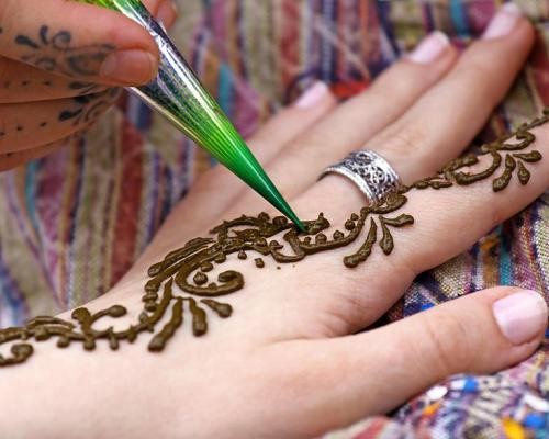 - On coupe l'extrémité d'un tube de henné ou on remplit une seringue à henné faite maison. Lentement, ligne par ligne, vous transférez le motif sur la peau. La pâte que l'on presse sur la peau doit avoir une épaisseur d'environ 2 mm. Si vous faites une erreur, enlevez l'excédent avec un coton-tige.