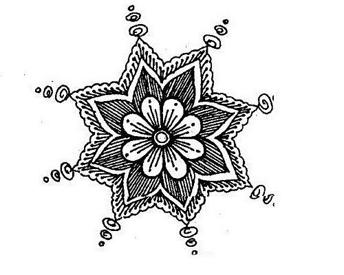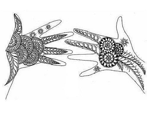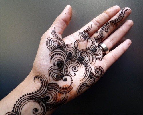 La fantaisie des maîtres du mehendi ne connaît pas de limites, vous pouvez couvrir toute la main de motifs, ou vous limiter à quelques anneaux peints sur les doigts et à un lotus sur la paume. Les étoiles, les fleurs et les trèfles sont parfaits. Pour les débutants, les dessins à la main mehendi du soleil et des fleurs conviennent.