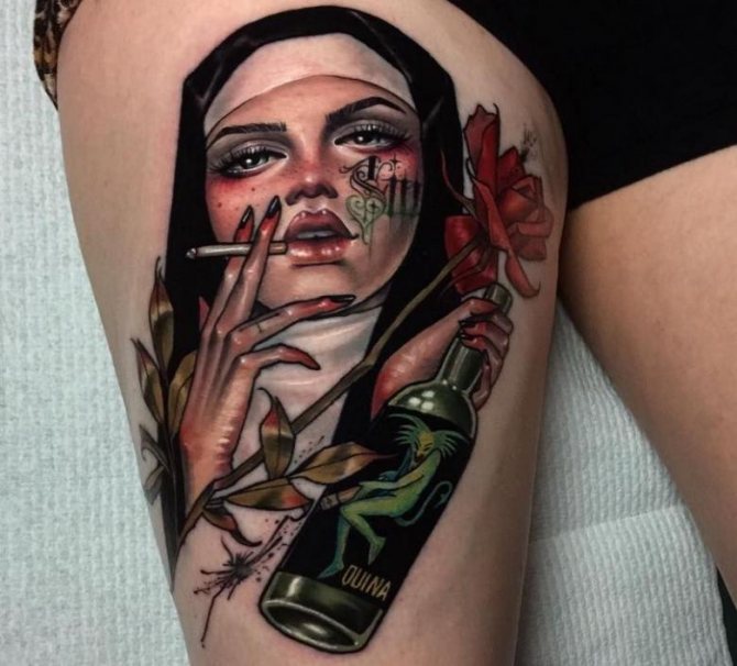 Si le tatouage d'une religieuse est réalisé dans un style cartoon, avec un soupçon de débauche ou de pornographie pure et simple, cette personne n'a manifestement aucun respect pour l'église et la foi. Mais de nombreuses personnes choisissent aujourd'hui ce thème simplement pour des raisons esthétiques, et il faut en tenir compte, et ne pas attribuer aux gens une religiosité qu'ils n'ont jamais eue.