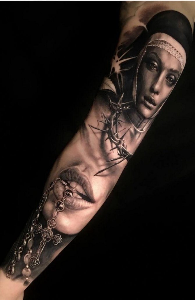 Un beau visage de femme dans une cape de religieuse, avec une croix et un chapelet, dans une pose de prière ou avec les yeux couverts, nous regardant tendrement depuis le corps d'une autre. Cette esquisse restera sûrement dans les mémoires, car le tatouage de nonne ne se rencontre pas très souvent, mais il est toujours fait de manière aussi gracieuse et détaillée que possible. Et la signification profonde du portrait conduit à des réflexions philosophiques, en plus du plaisir esthétique.