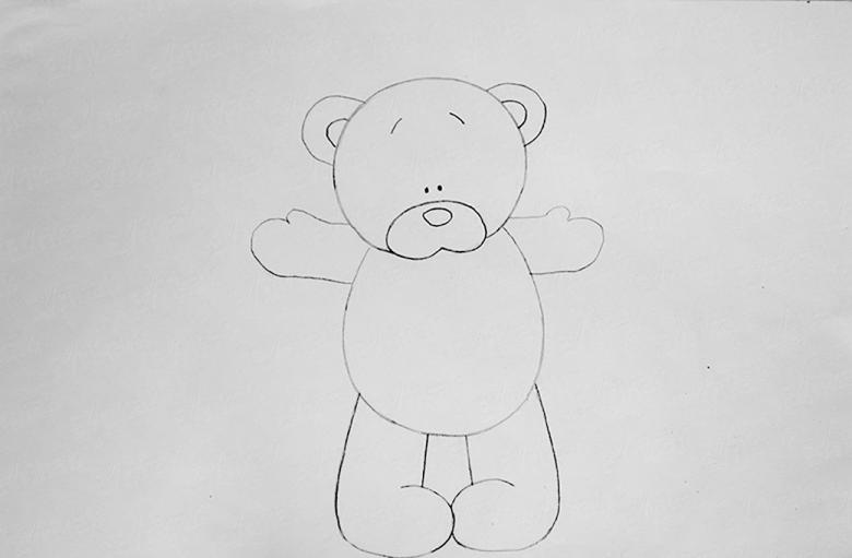 - Sur la tête, nous dessinons de petites oreilles, des yeux en forme de boutons, une bouche et un nez. Ours assis, alors dessinez des pieds clairs. Une main est cachée derrière le dos et l'autre main est sur le ventre.
