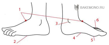 - Des lignes convexes marquant les chevilles sont tracées des deux côtés. L'os interne de la cheville est légèrement plus haut que l'os externe de la cheville.
