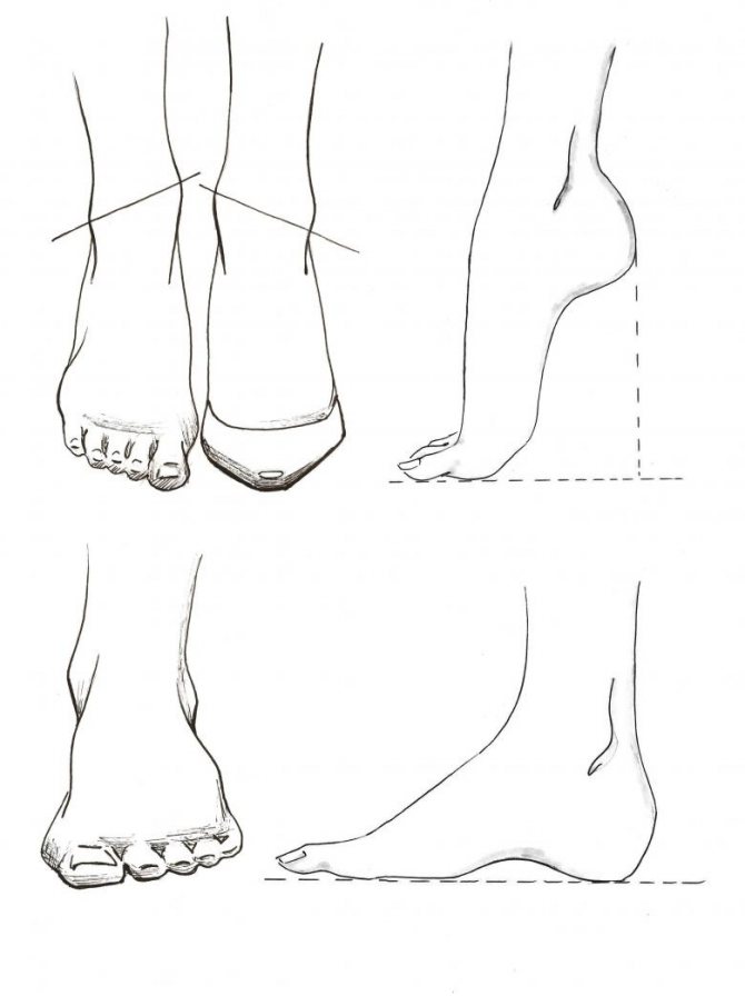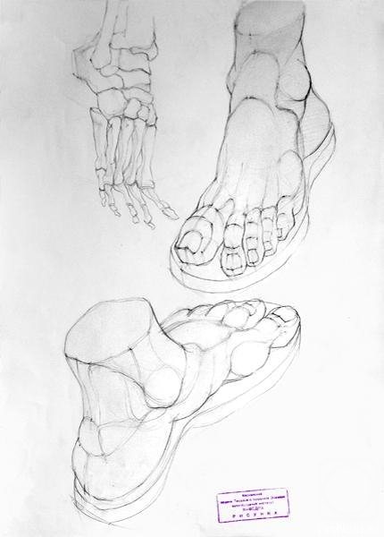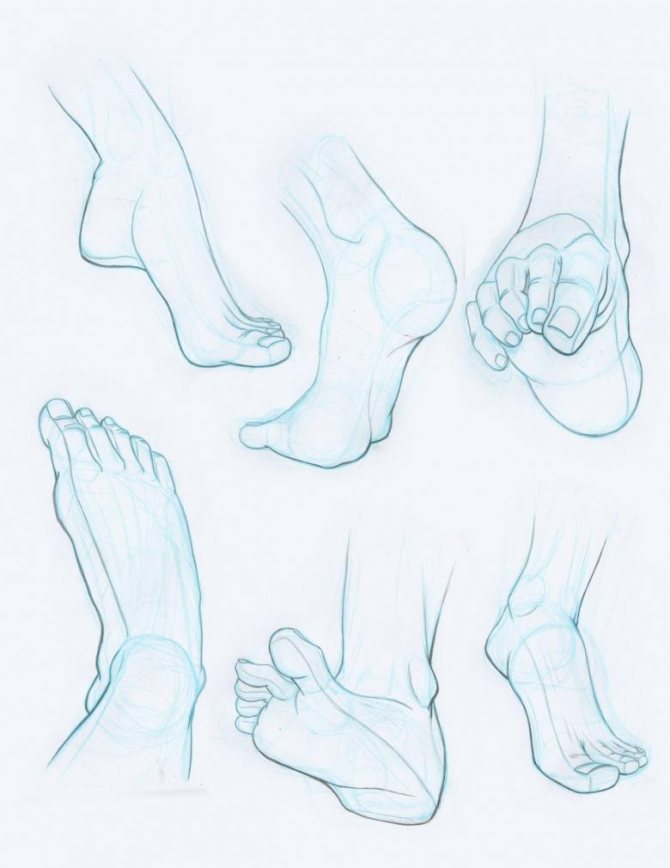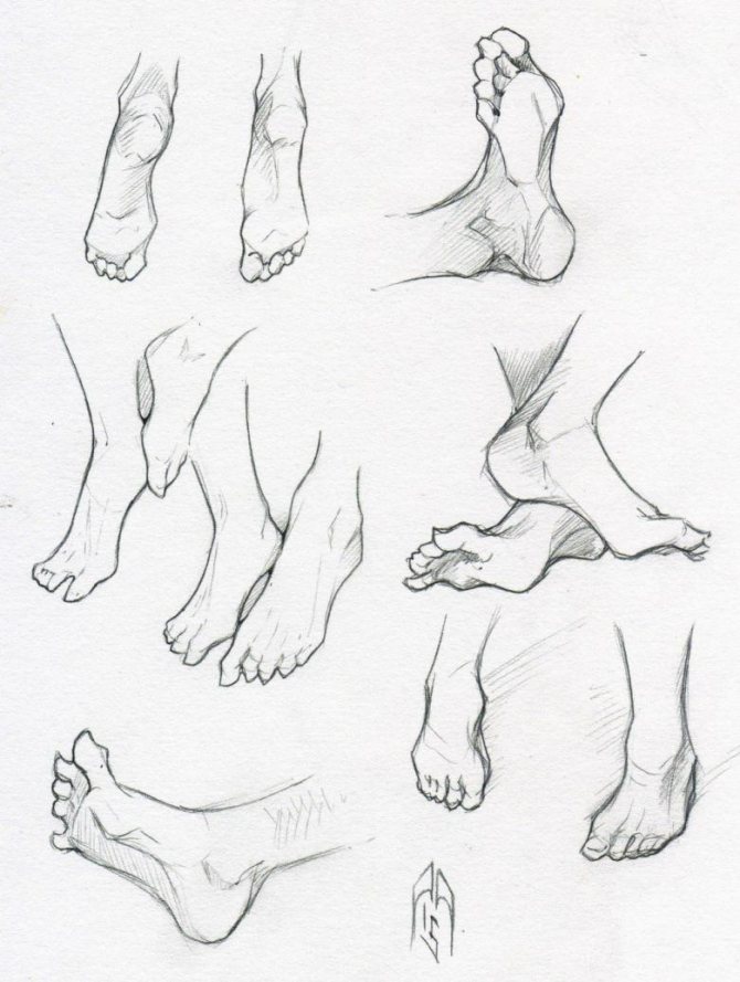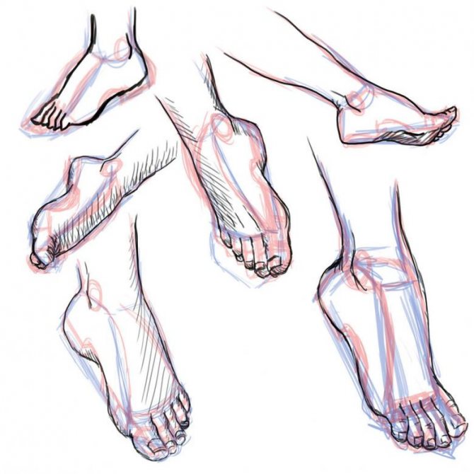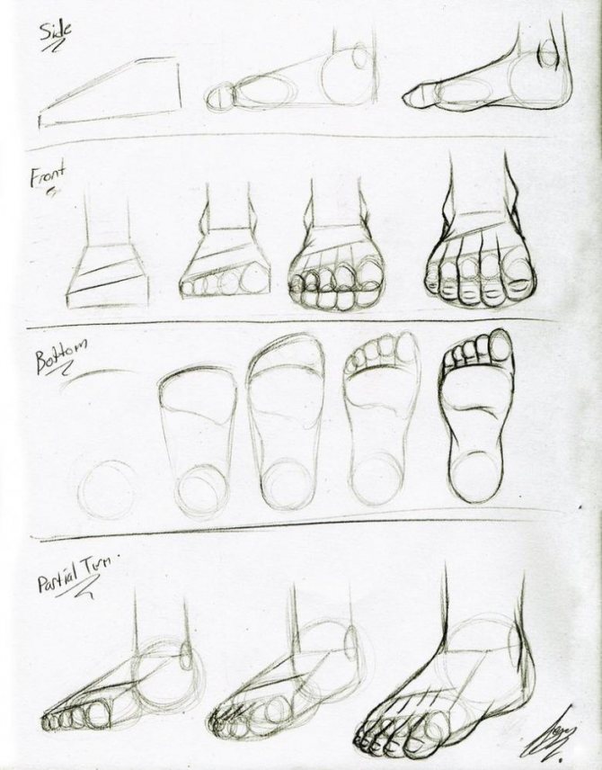 Les débutants dessinent souvent des pieds plats comme des crêpes ou des parallélépipèdes rectangulaires "collés" aux tibias. En réalité, le pied a une forme beaucoup plus complexe, avec de nombreuses protubérances et dépressions. Rappelez-vous qu'il y a des os à l'intérieur du pied, pas de la gelée ou un morceau de contreplaqué.