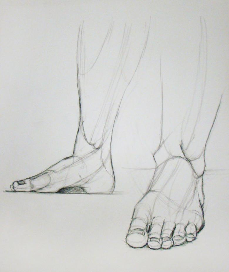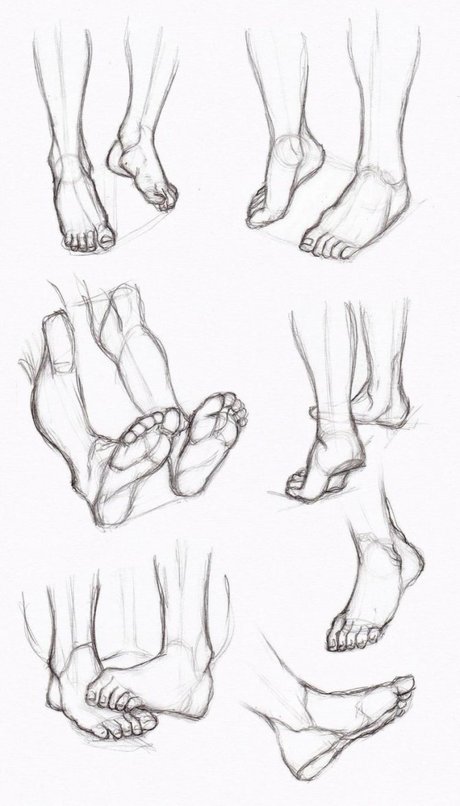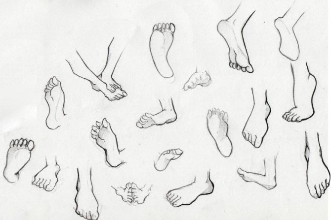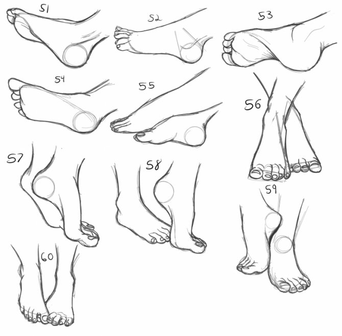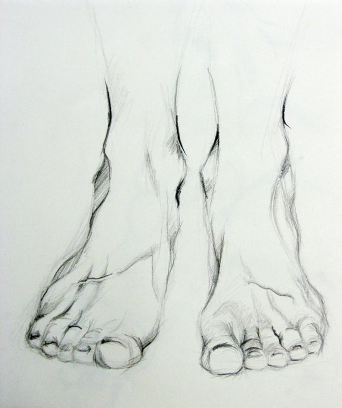 Les orteils ne sont pas bien ronds (ou en forme de saucisse), ils se touchent et se pressent les uns contre les autres. Le gros orteil est légèrement à l'intérieur du pied et les autres sont légèrement vers lui. La plus grande distance est entre le pouce et le deuxième orteil (y a-t-il un index ?). Habituellement, les orteils sont raccourcis du pouce à l'auriculaire, mais il arrive que le deuxième orteil d'une personne soit plus long que le pouce - faites-y attention lorsque vous dessinez le pied particulier d'une personne.