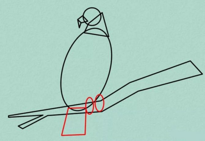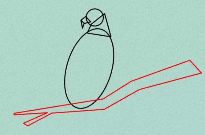 - Juste en dessous de ce point, vous devez tracer une ligne horizontale un peu plus à droite. Vous y dessinerez le plumage. Maintenant, de cette ligne au centre, tracez une diagonale à un angle de 30-40 degrés. Faites une diagonale en arc léger. Ce sera le contour de l'aile.